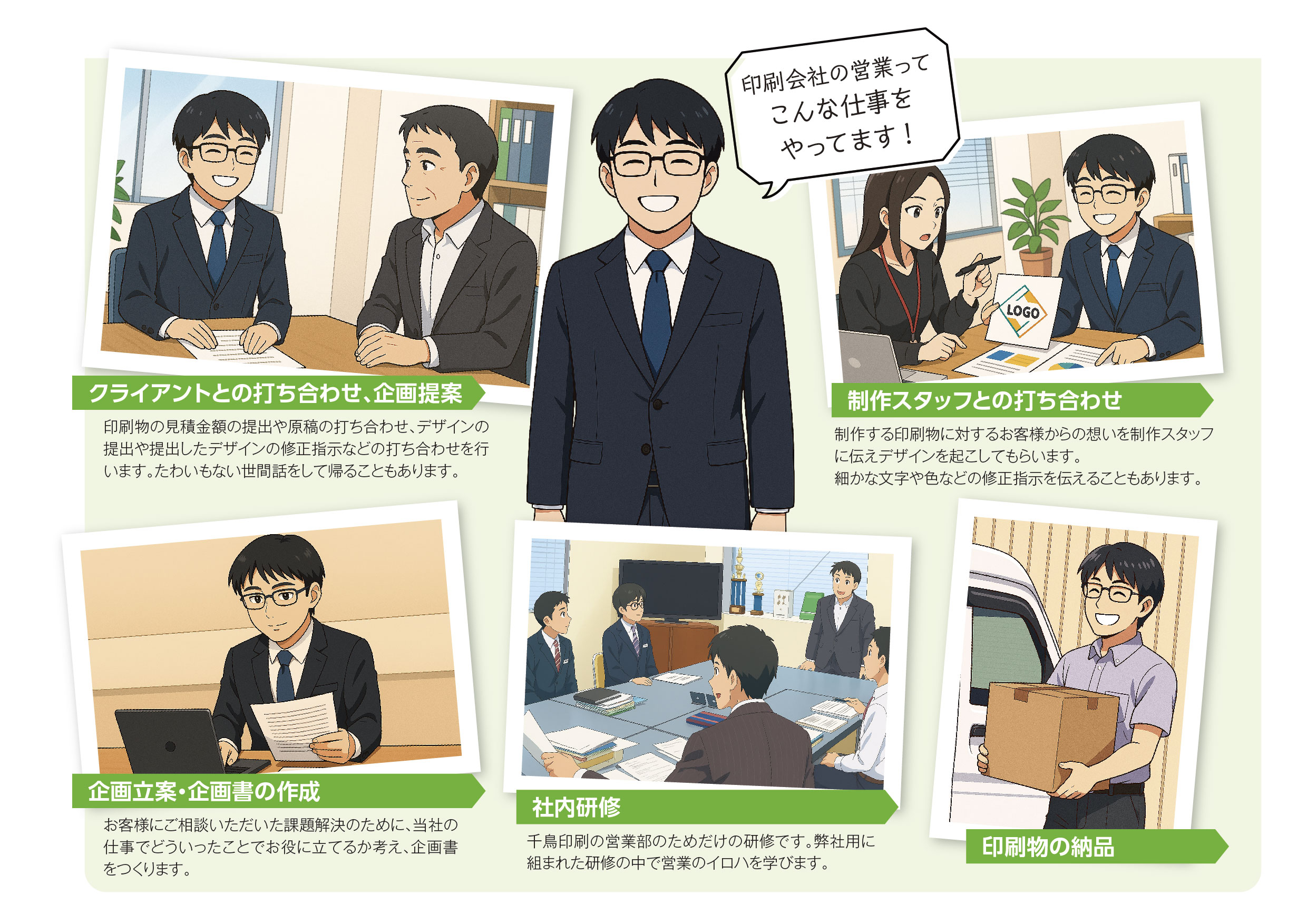 ●営業の仕事は、商談の他に、見積書や提案書の作成、作業指示書作成、原稿の打ち合わせ、校正のやりとり、印刷物の納品などがあります。