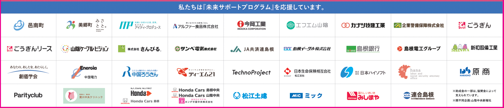 この助成金は、島根県内企業・団体から募った協賛金(山陰中央新報社「ミライサポートプログラム」主催)を一部財源にしています。