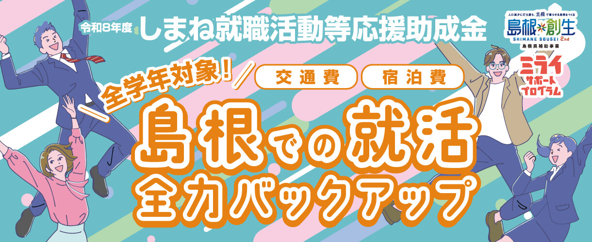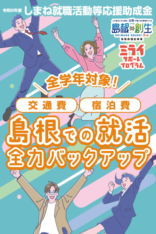 ジョブカフェしまねでは、学生の皆さんの県内就職を応援するため、民間企業と一緒になって、島根県での就職活動や就業体験に必要な経費(交通費・宿泊費)を助成する制度を設けています。