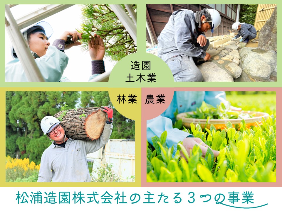 『環境と緑の創生』を社業方針とし、①【造園・土木業】庭の設計・施工、植栽管理、公共インフラ工事等、②【林業】契約森林の伐採、素材・チップ生産、③【農業】植物性堆肥による有機栽培・加工・販売を行っています。