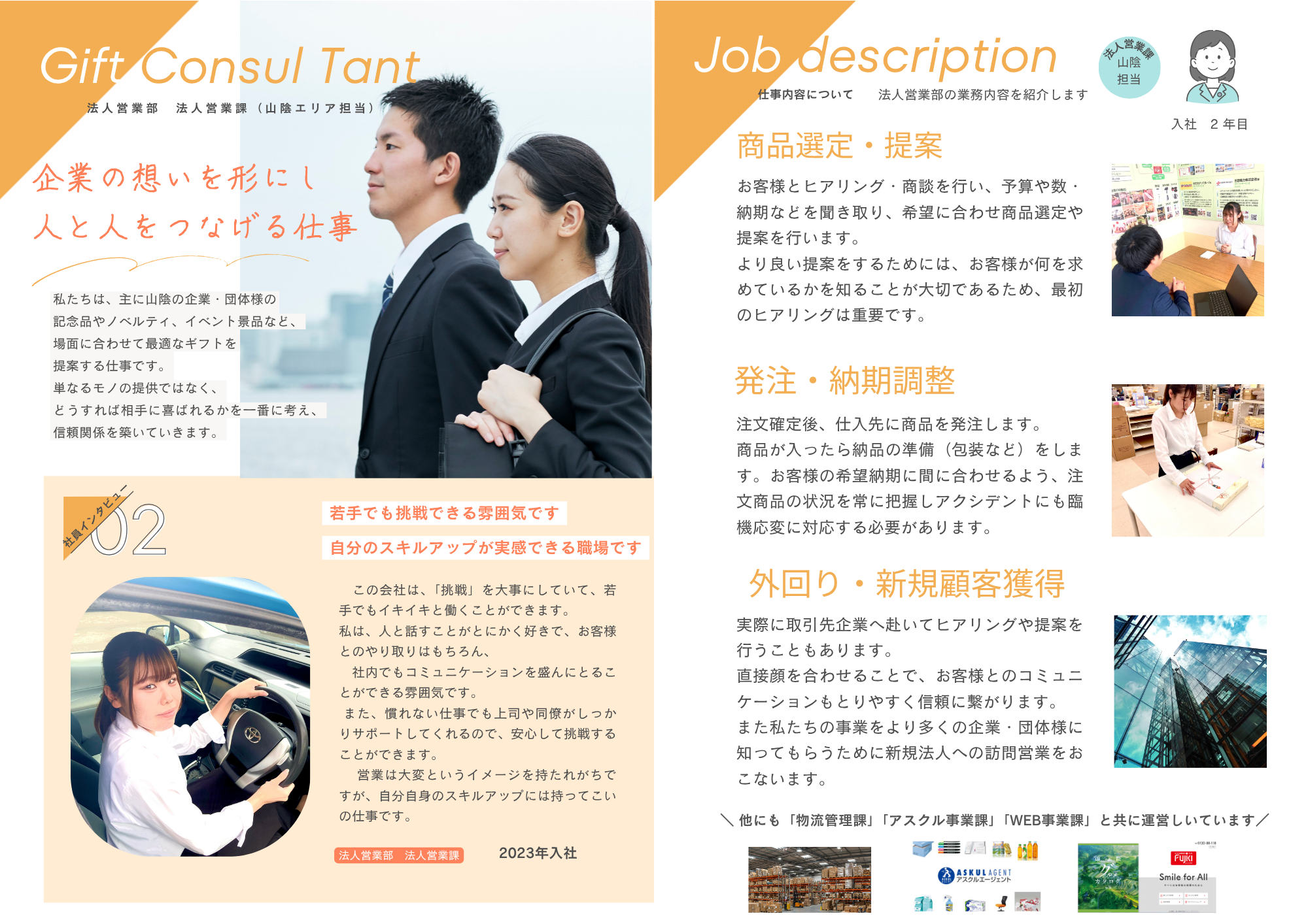 ギフト用品販売(6店舗、法人営業)、ポイントシステム事業(各企業等のポイント交換景品、各種キャンペーン景品の手配~個別発送)